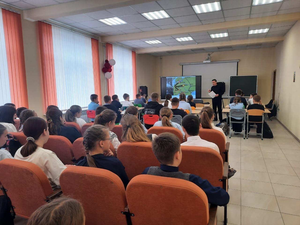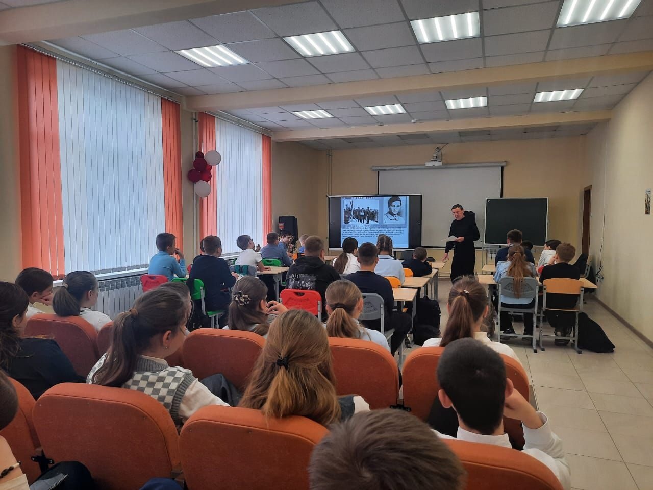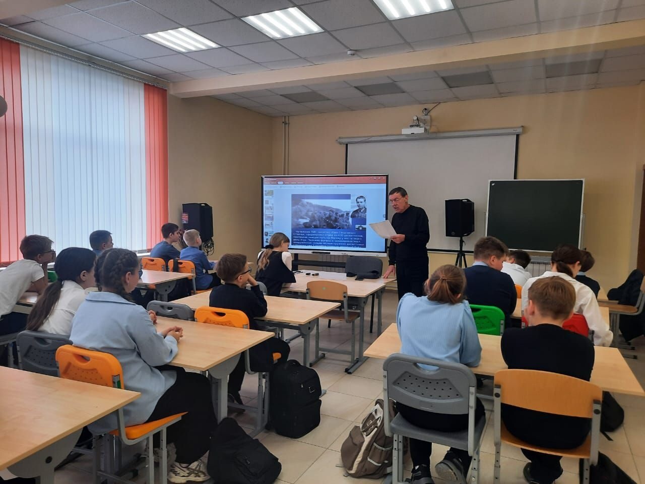 Методист районного Центра культуры по патриотическому воспитанию С. М. Хомяков провел урок мужества, посвященный Дню воинской славы России.7 ноября 1941 года, когда фашистские войска рвались к Москве, на Красной площади состоялся парад в честь 24 годовщины Великой Октябрьской социалистической революции. Войска и техника прямо с парада ушли на фронт. Обучающиеся школы посмотрели презентацию «Парад 1941 года», Сергей Михайлович рассказал о борьбе советской армии и всего народа с фашистами на подступах к Москве, о значении парада для поднятия морального духа советских людей. Такие мероприятия необходимы подрастающему поколению! Нужно изучать историю Великой Отечественной войны, помнить имена и подвиги героев. Помнить о том, что когда-то касалось всех нас... Только за одно то, что перенес русский солдат на своих плечах, он достоин священной памяти своего народа.