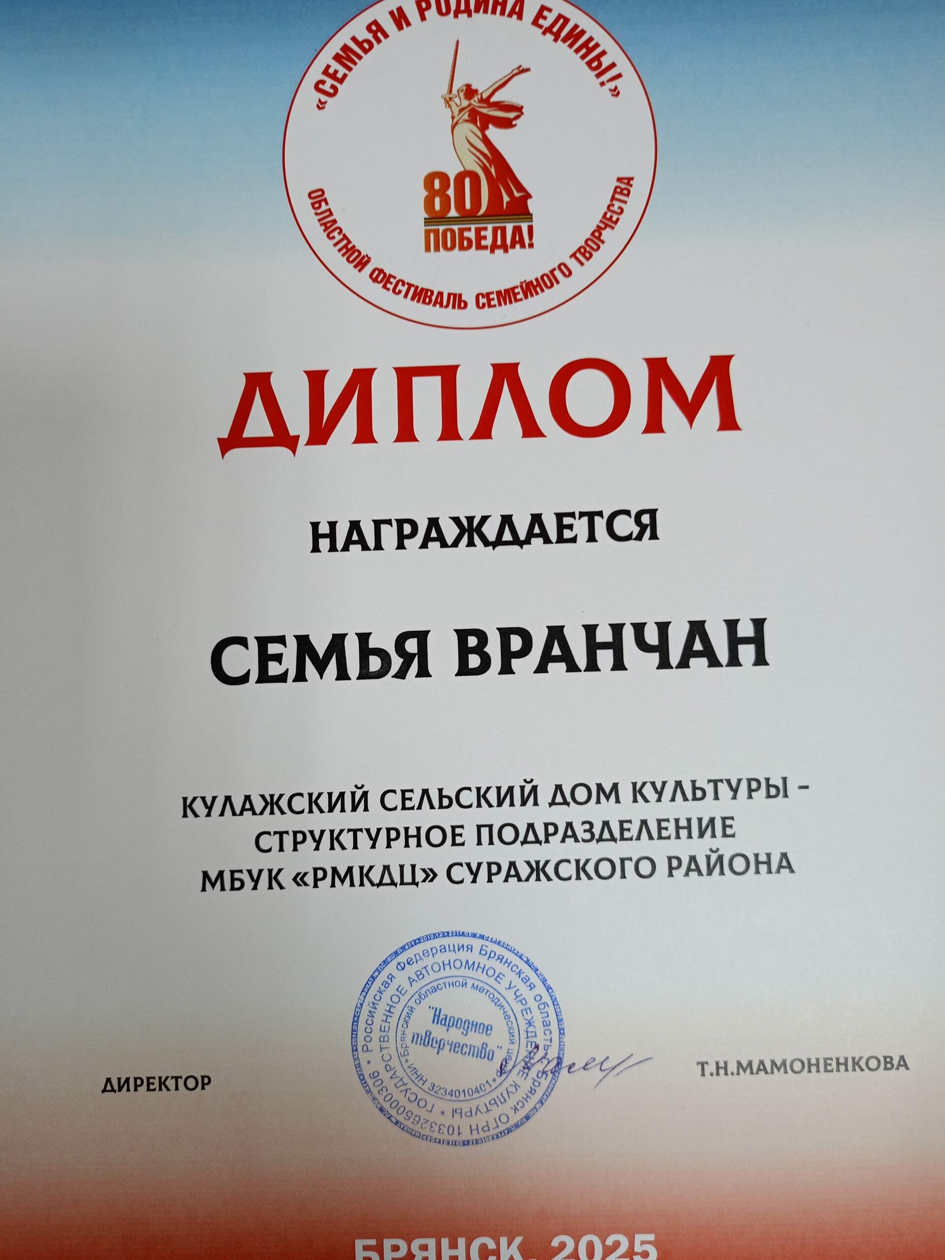 В Брянском областном методическом центре «Народное творчество» прошел областной фестиваль семейного творчества «Семья и Родина едины!», посвященный 80-летию Великой Победы и Году Защитника Отечества по следующим номинациям: "Семья талантов", "Радость нашего дома", "Семейные строки", " Фотоискусство".