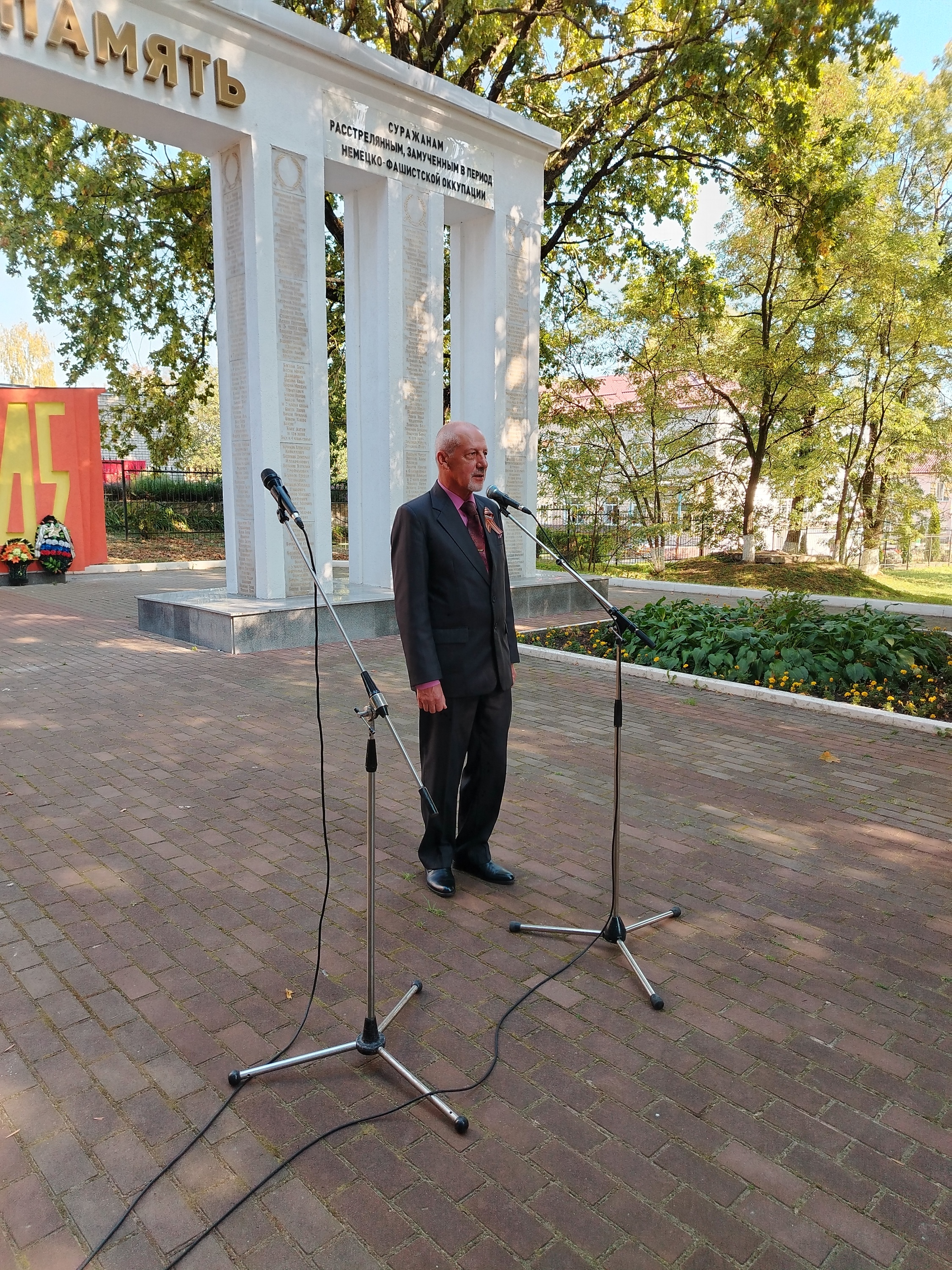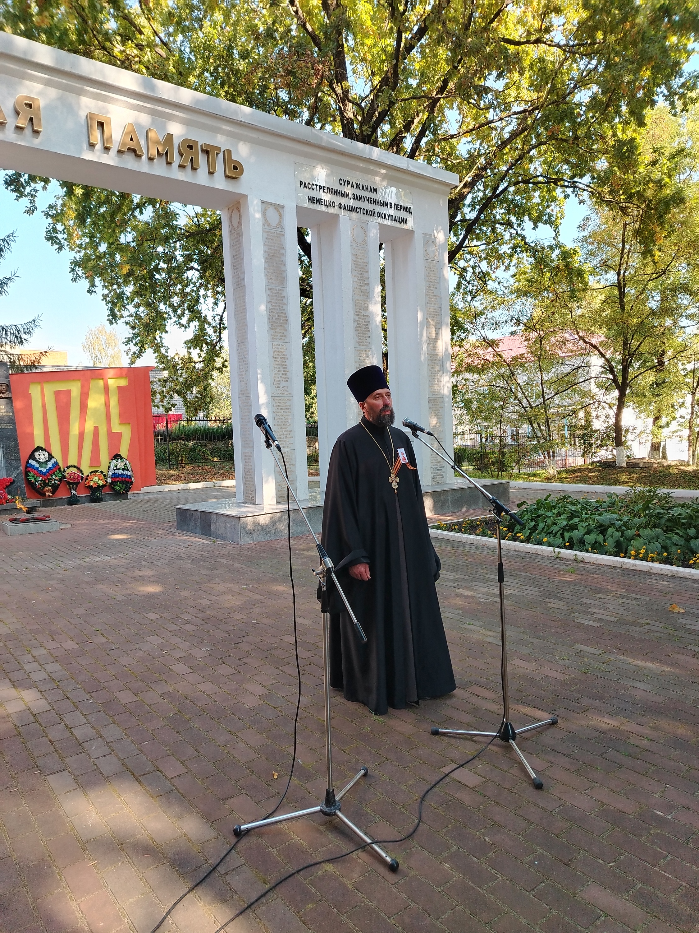 С приветственными речами к собравшимся обратились глава администрации Суражского района С.В. Толока, военный комиссар Суражского района С.Н. Агеенко, председатель районного совета ветеранов войны и труда Суражского района И.И. Иванченко, а также протоиерей Владимир, Благочинный по Суражскому церковному округу. Присутствовавшие почтили память земляков, невернувшихся с полей сражений, минутой молчания и возложили цветы к мемориалу суражанам павшим за Родину.